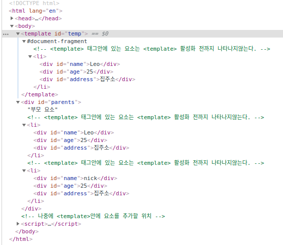 또한 원래의 <template> 는 그대로 남아 있는 것으로 보아 부모 요소 아래에 복제된 것을 알 수 있다. (주석도 복사가 된다!)