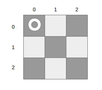 3*3 보드판이 있다고 가정하고 (0, 0)칸에 처음 퀸 말을 둔다고 가정하자.