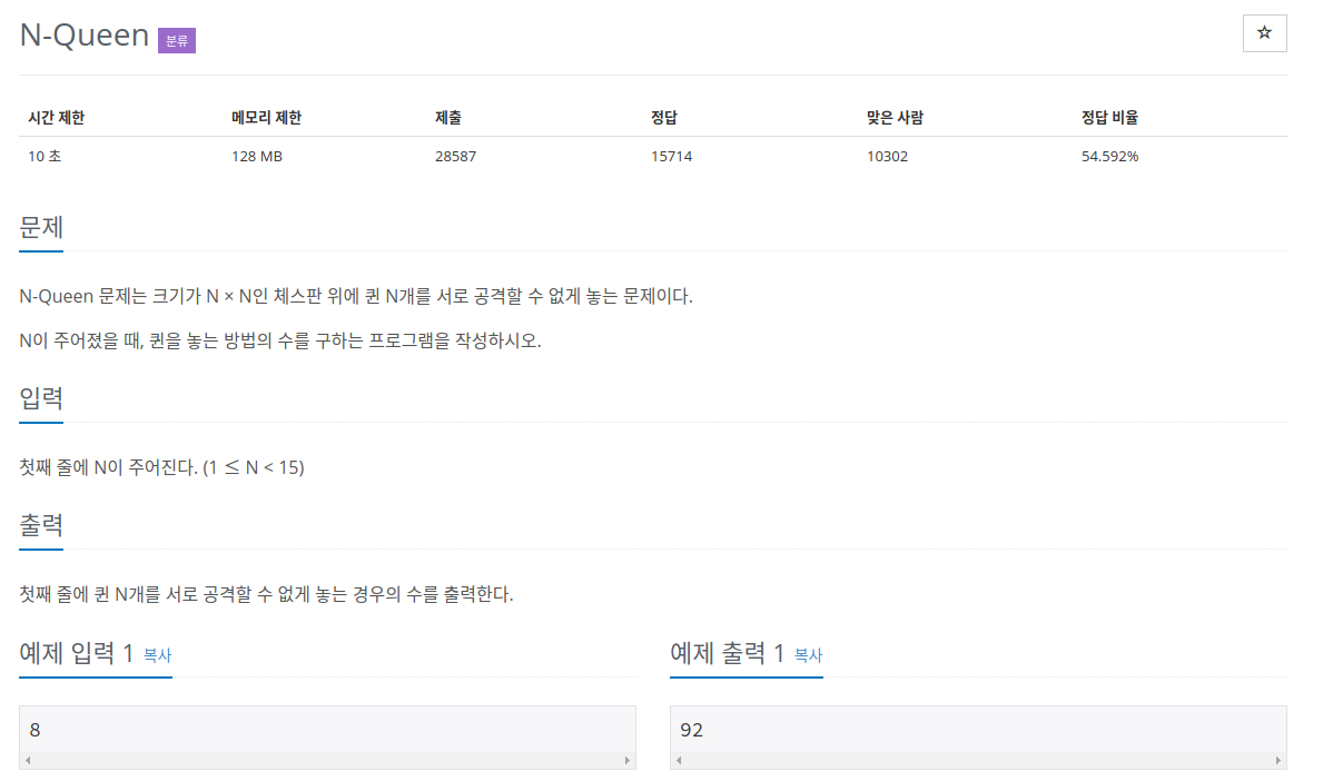 다음은 알고리즘 사이트로 유명한 백준에서 N-Queen문제이다.