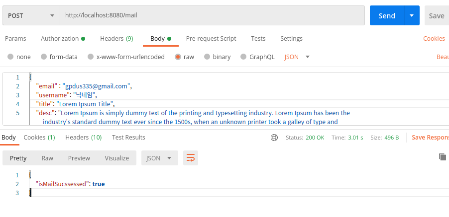 해당 코드는 /mail url로 라우팅을 시켜주었고 post 요청으로 받을 수 있게 해 주었다.