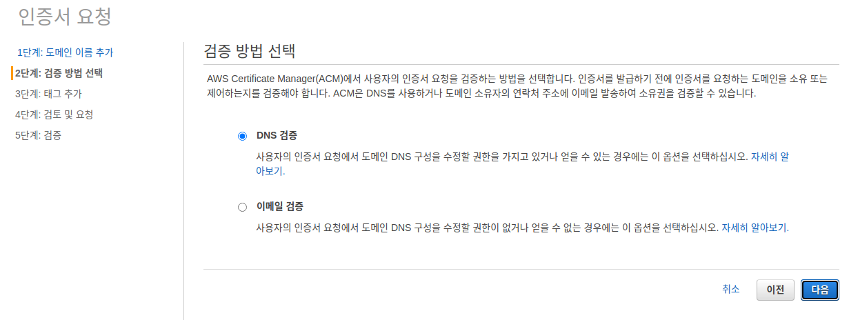 DNS 검증을 누른 후 다음으로 진행한다.