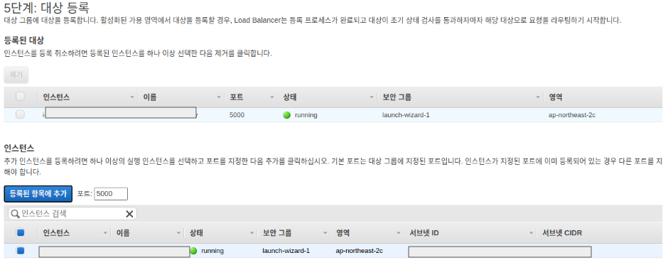 그다음 대상을 등록해준다. 해당 인스턴스를 찾아 등록된 항목에 추가해주면 된다. (포트를 내 ec2 인스턴스의 사용자 지정 포트를 사용했다.)