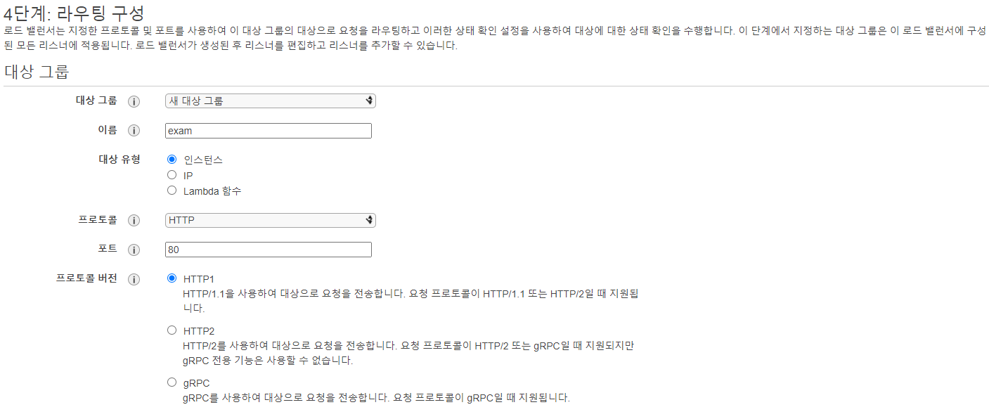 대상 그룹은 새 대상 그룹으로 지정해주고 이름을 적어준 뒤 아래 프로토콜을 HTTP로 포트는 그대로 80을 사용했다.