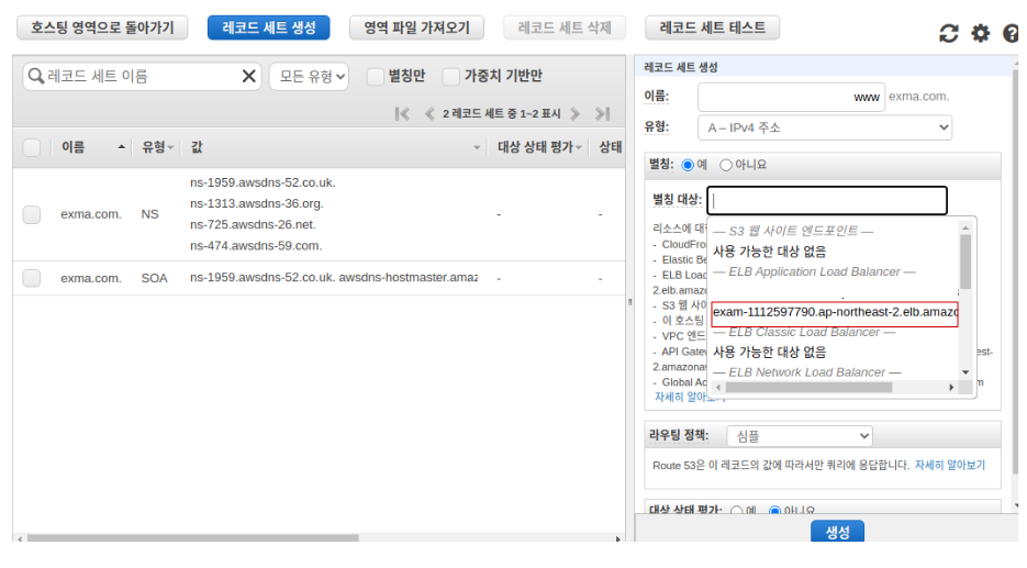 이때 유형은 A로 해주고 별칭을 허용하는데 여기서 방금 생성한 Load Balancer를 선택해준다. 그리고 생성을 눌러준다.