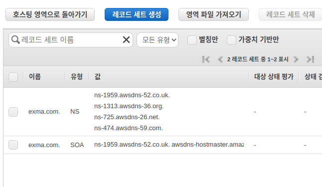 호스팅 영역에서 해당 호스팅을 클릭한 뒤 레코드 세트 생성을 눌러 레코드를 생성해준다.