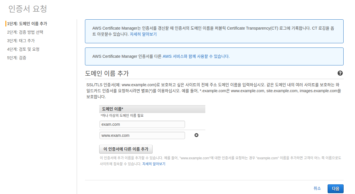 도메인 이름을 추가하는데 발급받은 도메인을 넣어주어야 한다.