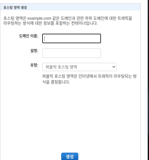 호스팅 영역으로 들어와서 호스팅 영역 생성을 눌러준다.