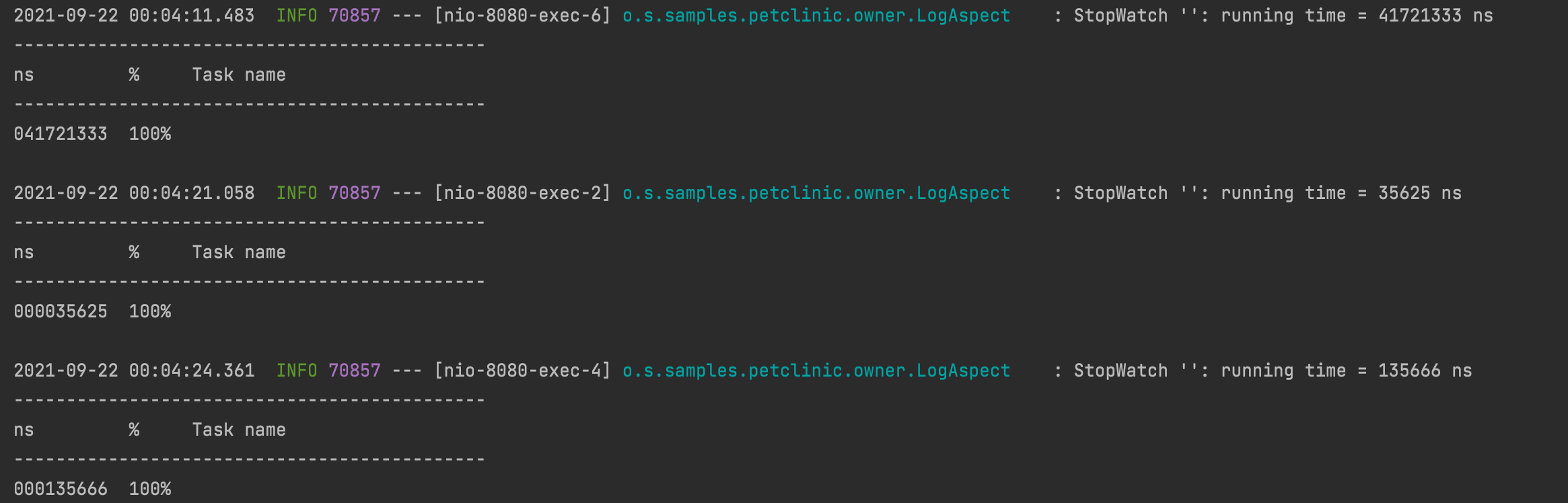 실행을 해보면 실행 시간이 log 로 찍히는 것을 볼 수 있다.