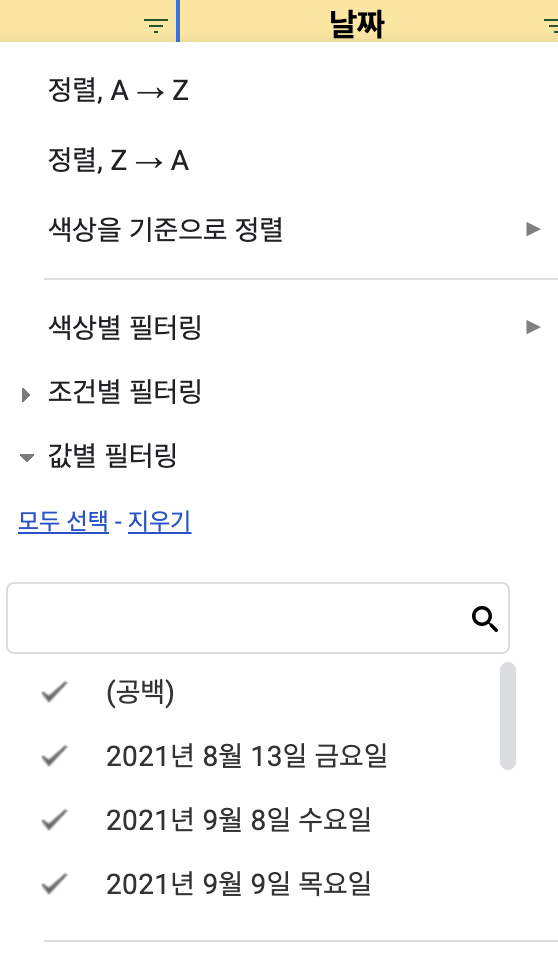 필터는 필터로 추가하고 싶은 컬럼을 영역 잡은 다음 상단에 필터 버튼을 눌러서 만들었다.