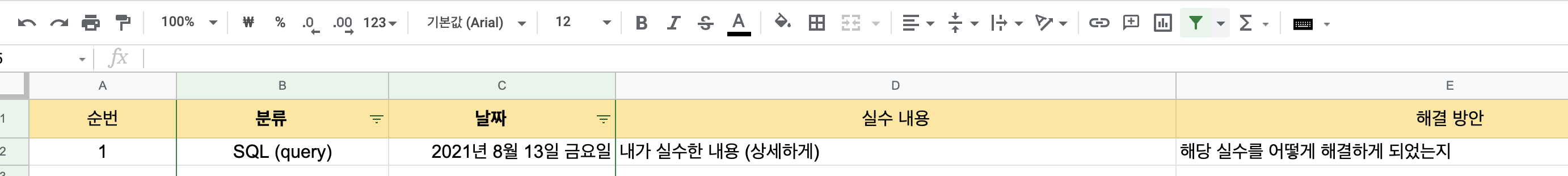 실수 노트에는 순번, 분류, 날짜, 실수한 내용, 해결 방안, 다짐, 참고자료 컬럼을 만들었고 분류와 날짜에는 필터링 기능을 넣어 원하는 분류와 날짜만 골라서 볼 수 있도록 했다.