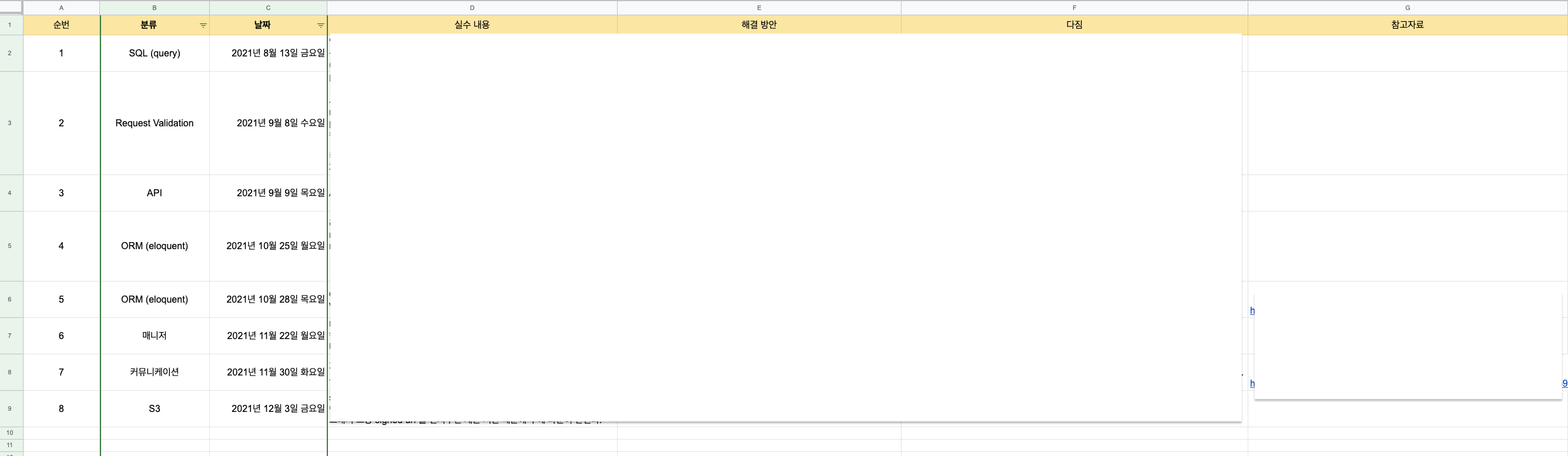 실수 노트에는 순번, 분류, 날짜, 실수한 내용, 해결 방안, 다짐, 참고자료 컬럼을 만들었고 분류와 날짜에는 필터링 기능을 넣어 원하는 분류와 날짜만 골라서 볼 수 있도록 했다.