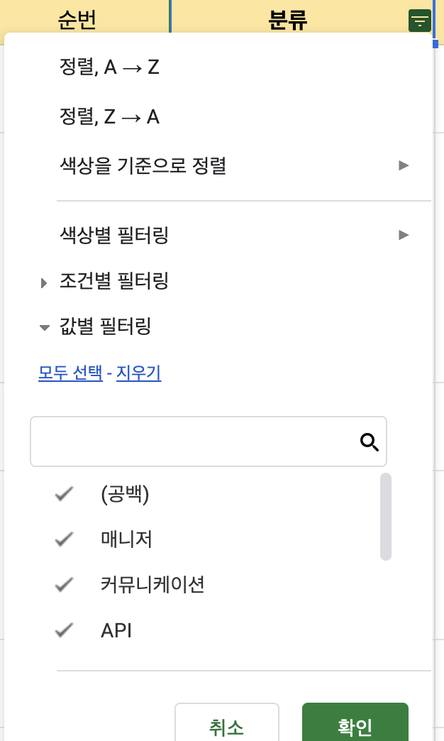 필터는 필터로 추가하고 싶은 컬럼을 영역 잡은 다음 상단에 필터 버튼을 눌러서 만들었다.