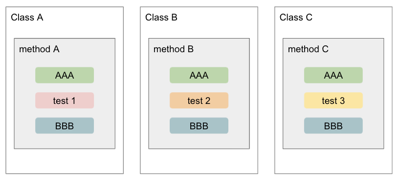 Class A, B, C 의 핵심적인 로직(가운데 test 블록)은 그대로 두고 겹치는 부분만 따로 빼준다면 (모듈화 시켜준다면)